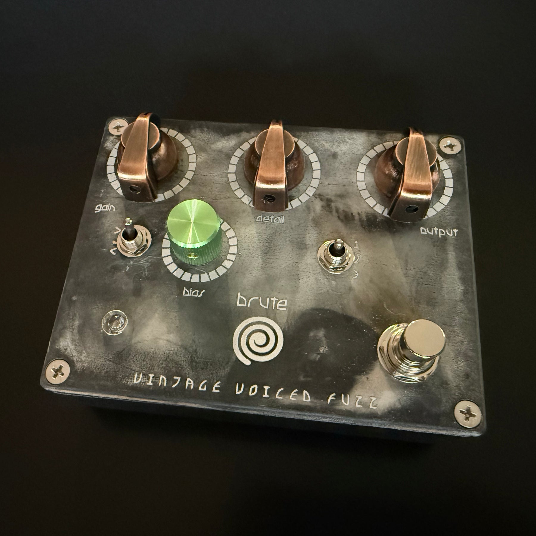 This Wild Card Brute has a stunning oxide top, complementary copper style knobs and a green bias knob and green LED. Inside in the first diode position is a grinning green Skully 80n carried over from our Halloween editions. A single asymmetrical Fairchild silicon diode is in the #3 position. The center toggle is a blower so you can hear that full complement of BC108B/C transistor set all by themselves. A Low-Cut toggle allows you to shave off some low-end if you are going into an already cooking amp.